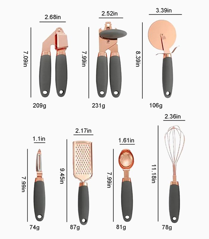 Introducing our 7-Piece Cooking Set with Soft Touch Black Handles and Premium Copper-Coated Stainless Steel. These versatile utensils offer precise control and style in one. From can opening to ice cream scooping, our set has you covered. Cleaning is a breeze with dishwasher-safe design, and each tool features a convenient hanging hole for easy storage. Upgrade your kitchen essentials today!